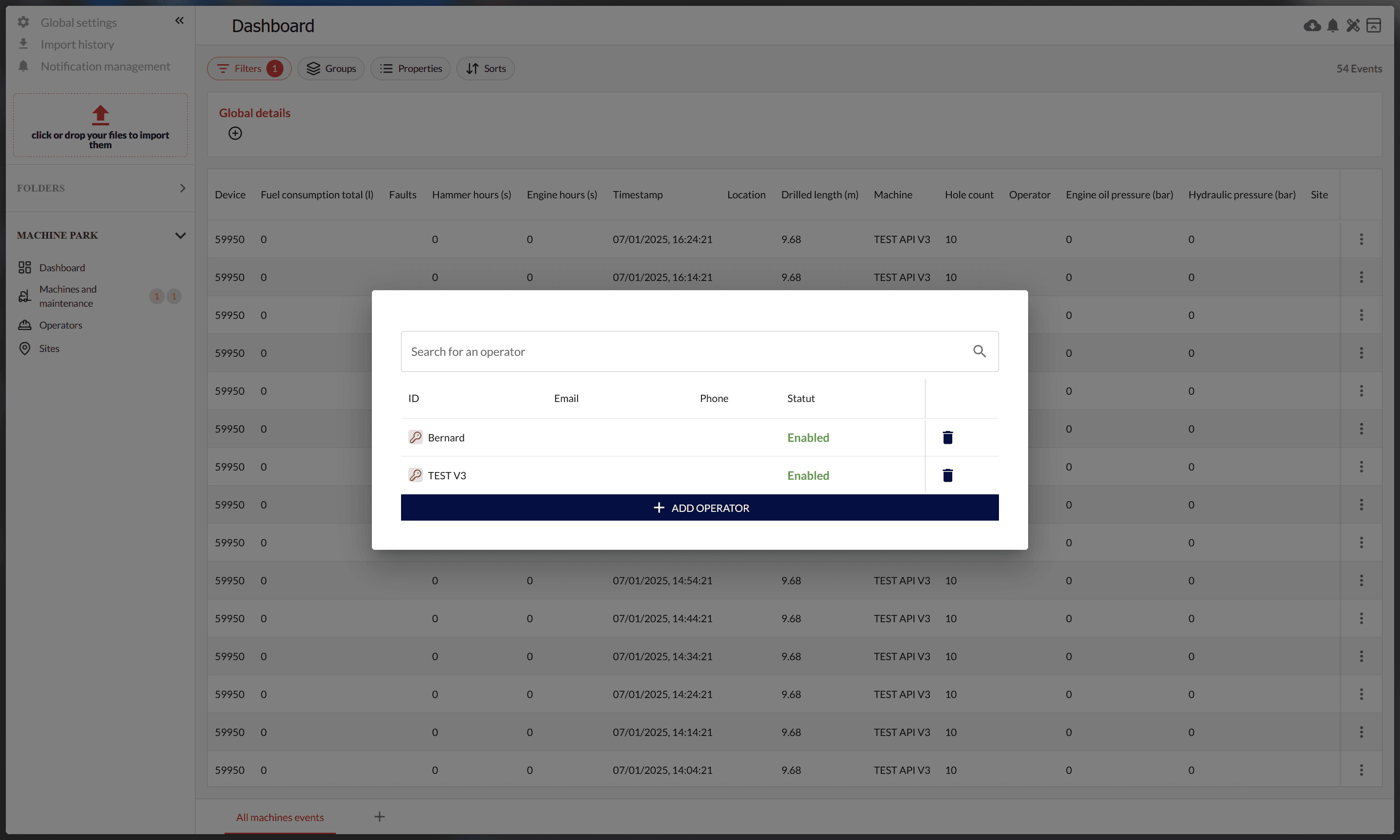 Operators are the agents responsible for operating the machines. Every event sent from a machine is linked to an operator, ensuring that any occurrence can be traced back to its source. This traceability is essential for accountability and effective management. To access the operators management popup, click on Operators in the sidebar.