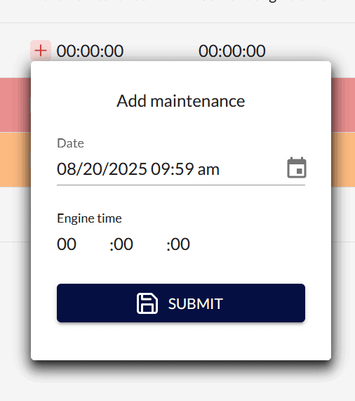 To add a maintenance entry, click the + action button in the Next maintenance column. A popup will appear, prefilled with the current time and the last known engine time of your machine. These data points are editable, allowing you to adjust them as necessary to reflect the most accurate information.